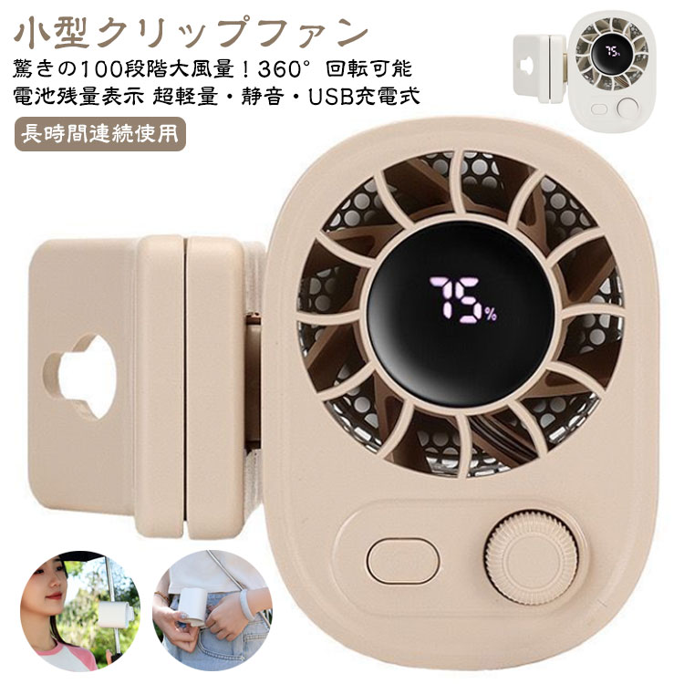 驚きの100段階大風量!360°回転可能超軽量・静音・USB充電式長時間連続使用電池残量表示小型クリップファン見た目からは想像できない、びっくりの涼しさ。小さくても、風はしっかり。暑い夏のおでかけが変わる予感。●日傘にちょこん。風はバッチリ。スマホより軽い123gだから、日傘につけても肩がラク。しかも風はパワフルで、顔まわりに涼しい風がしっかり届きます。●風の強さは100段階。「今日はちょっと涼し